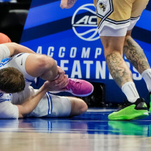 Mar 13, 2025; Charlotte, NC, USA; Duke Blue Devils forward Cooper Flagg (2) is injured in the first half at Spectrum Center. Credit:…