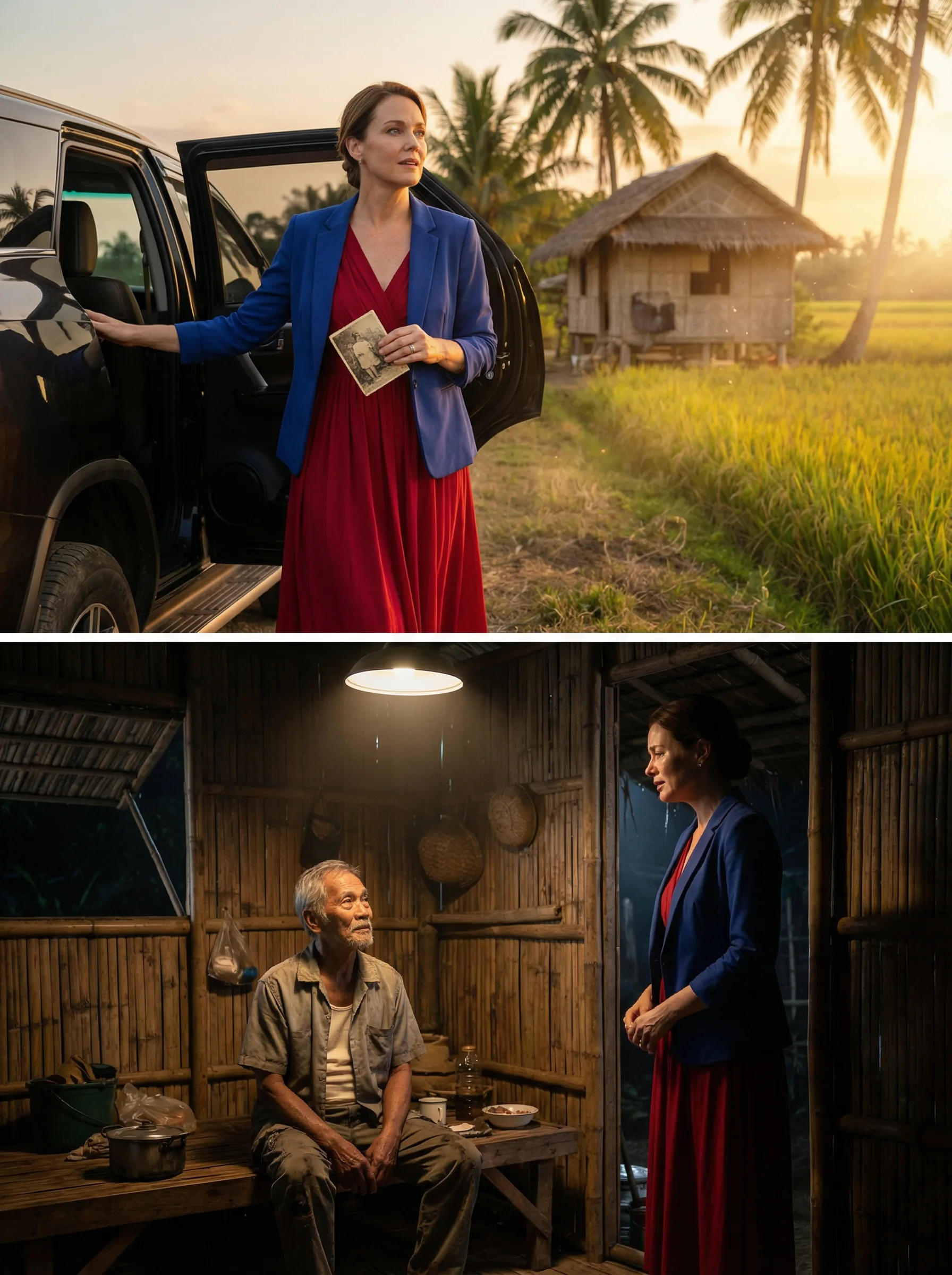Lumubog ang araw sa palayan, at ang ginintuang liwanag ay dumikit sa salamin ng itim na SUV na dahan-dahang huminto sa gilid ng makitid na daan. Bumukas ang pinto, at bumaba ang isang babaeng puti ang kutis, maayos ang buhok, at suot ang pulang damit na tinakpan ng asul na blazer. Sa kamay niya, may hawak siyang lumang litrato—kupas, may tiklop sa gilid, at may sulat sa likod.