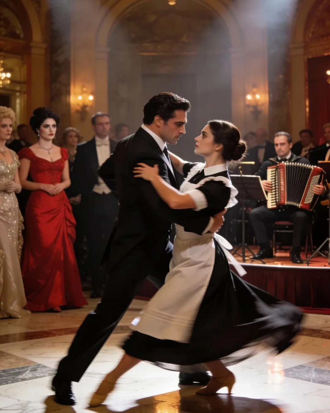 La música cambió y una pareja comenzó a bailar tango en el centro del salón, despertando murmullos de admiración fingida.