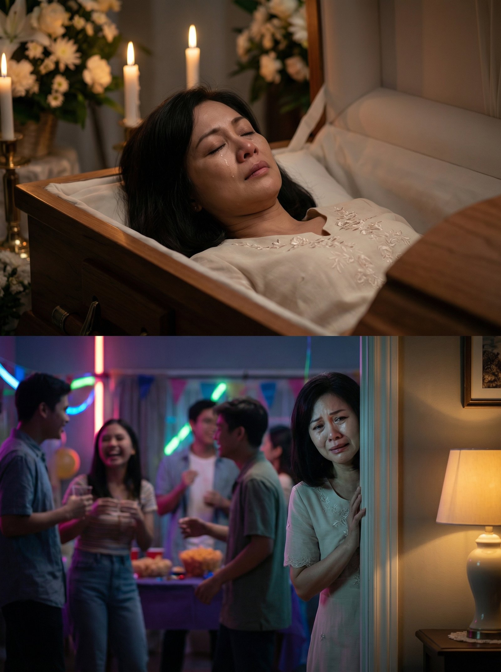 Sa loob ng isang malamlam na funeral parlor na may amoy ng kandila at puting bulaklak, nakahimlay si Clara sa isang kahong yari sa makintab na kahoy. Nakasuot siya ng simpleng puting bestida, maayos ang buhok, tila payapang natutulog. Sa gilid ng kanyang pisngi, may bakas ng luha—isang detalyeng hindi napansin ng mga dumadaan upang sumilip at magbigay ng pormal na pakikiramay.